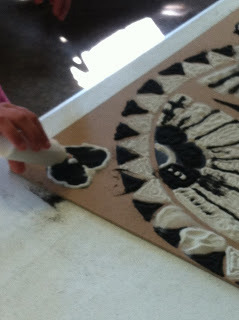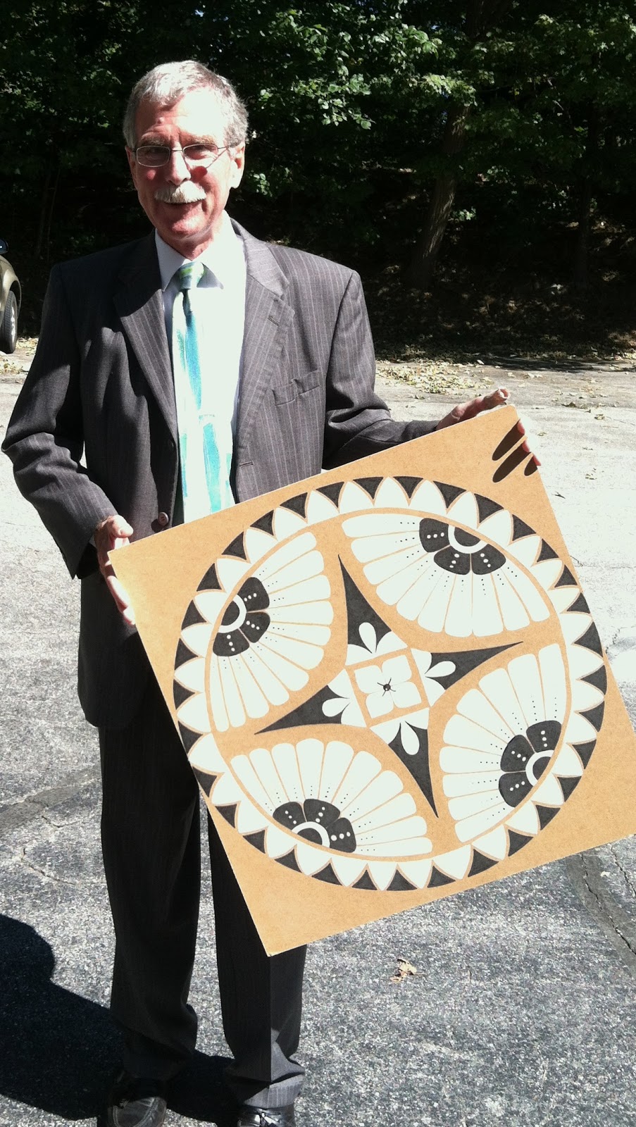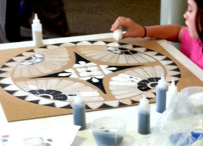 • I used black and white Sharpie oil-based markers to draw in all the tangles, then filled the larger shapes with black and white acrylic paint. I ended up using white gesso to get better coverage over the brown board. I was careful to keep all the brush strokes very smooth (so the sand wouldn't catch on them). Since some of the church council members had expressed their doubts about doing something "artistic" :-) I wanted to prove that this was easy and satisfying and anyone could do it. So I created the mandala on the board as if it were a template - like a coloring book or paint-by-number. I put the suggested colors down and all they would have to do was fill it in. (See the last picture with the Rev. holding the painted board)