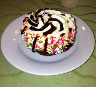 The hotel made cupcakes to celebrate Terry's birthday. They included bottles of chocolate sauce so we could tangle them ourselves! Sweet!
