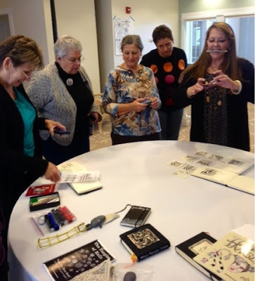 Prints of textures on wood, then tangledI'm not going to tell you what we did AFTER lunch - you have to come to a retreat to find out for yourself. Oh? Yes - just so happens there is a retreat next week! There are a couple of spots still open if you would like a chance to hang out with a select group of Zentangle fanatics. ;-DHere are a few more shots...