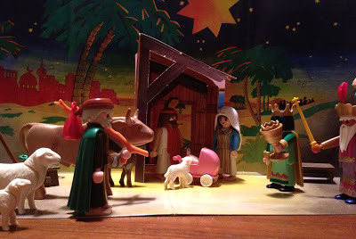 Joy to the Modern Family!I could just post the above picture, wish you happiness and move on to the next holiday task....No, that's too easy. I want to share a couple more things. My Playmobil manger and three Playmobil advent calendars (yes, three!) had been lost for years. it drove me crazy that I couldn't find them. Then, when I moved all my junk from my mom's attic a month ago - I found all sorts of forgotten treasures, including the Playmobils.
