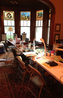 Beyond the classroom is my inner sanctum - actually, this is Bumblebat - where I do all my Etsy orders. The amazing painted cabinet (I used to paint furniture) features two characters from my old stamp company (Bartholomew's Ink), Edgar with his raven, and the Baroness with her cat Gus.
