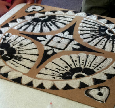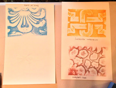 The Inn is covered with carved panels and textures everywhere. It made my job a breeze on Friday when I had the task of teaching printmaking with Zentangles. Our "warm-up" project was making impressions of textures using foam blocks.