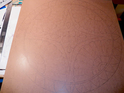 • Tracing around large round objects or stencils would be the easiest way to create the basic circles, but I couldn't find anything that big in my studio. so I did it the old-fashioned way. Using a long ruler, I marked the centers of each edge of the board, then connected those dots to find the center of the board itself. I measured out intervals along each axis where I wanted my circles to be. ie: 4" and 6".
