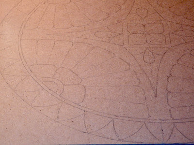 • Since I wanted this piece to be symmetrical, I lightly sketched in the basic shapes of the tangles. Normally, when doing a large Zentangle, a mural or such, I don't use any guides - I just draw.