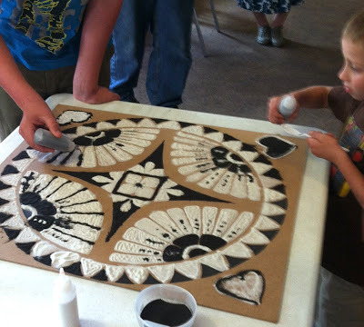 • An older women used black sand to draw lines between the flower petals and then the kids used that idea to embellish the embellishments.