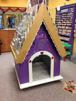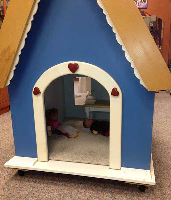 We won't dwell on the past, but just to put things in perspective, this is the sign that was on the door exactly one year ago. :-( It was really sad, but it was also a wonderful feeling to get to play Santa. We gave away so much stuff before Christmas, but even so, it took a few months to pack up all the remaining inventory and clean out the place.In the process of cleaning out the store room and the attic, I found some cool stuff - the best being the front and back of our A-frame display. The display was actually a "house" from a childrens' bookstore in Concord that closed when we first moved up here. Dan Hamilton put it back together for me and built new side walls. He even added carpeting. Lilah's dolls would tell you it is very plush. But no shoes are allowed in the house!