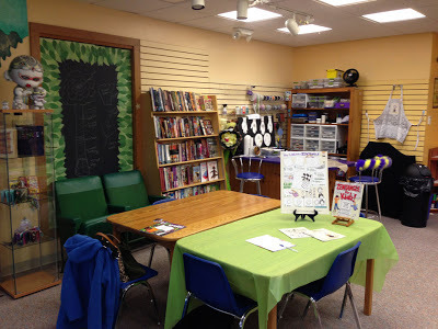 And here is the Art Bar for demos, face painting, shrink plastic... this is my favorite spot. Notice the little bookcase shrouded in black? This technique of hiding things behind curtains could become a crutch. Sooner or later I will have to actually clean all this stuff up!