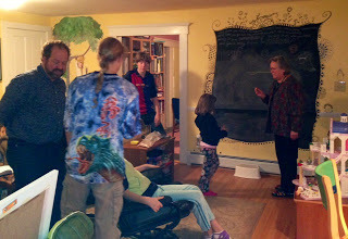 Since there is nothing like a deadline to motivate me to action, I decided to do an Open Studio on Dec. 8th when the whole town had a Holiday Shopping Tour. Even with the deadline, I was still floundering until Jacque showed up and actually started moving stuff. We resorted to the ages old tactic of "shove everything unnecessary into the other room and hide it with a curtain". Fabulous trick. Of course, everything is still in that room, but the studio looked great. Her son, Danny is in Kindergarten with my daughter so we brought them both back to the studio to "help"- which always seems to involve a lesson from Lilah on how to draw Lilah Beans....