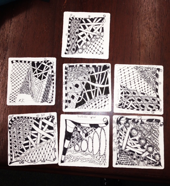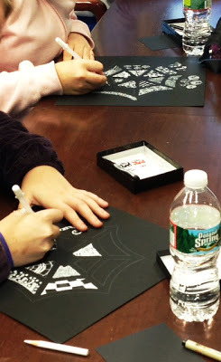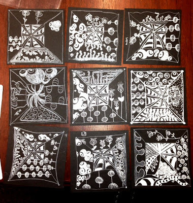 The first hour was classic Zentangle, except that I prefer using Sharpie Pens with younger people - for many, many reasons. The second half we did white on black. I tried to pick as many of the creepier tangles as I could squish onto two tiles. We did do shading, but I am still mastering my iPhone camera and its flash blew away the shadows!