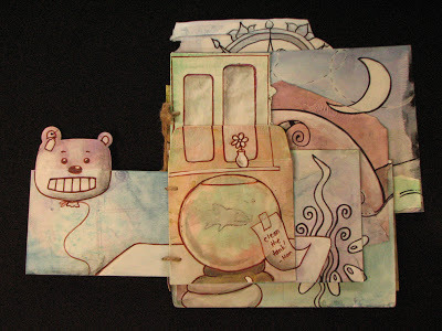 Here's the second page - the envelope's windows still make sense here. The "fishbowl" is actually the clear window on a CD envelope. I found this exercise really challenging! But then, I tried too hard to create backgrounds and such. Using more imaginary creatures might have simplified it... I have to try this one again some time.
