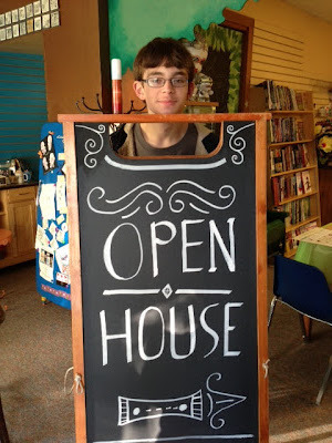 Today, my son crawled out of bed, around 2pm(!?) and reluctantly started designing my sandwich boards. He got really into it. Then his sister said, "I want to do what Alex is doing!". Predictable. So I said, "Sure!" Alex glared. Then, I said, "but I have an even better job for you... you can design the sidewalk sign!" Squeals of delight!