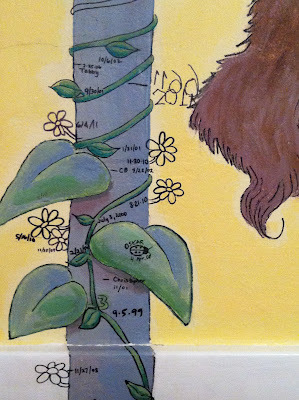 The leaves on the vine mark my son's growth, and the little flowers mark my daughter's. Ladybugs are for other friends and family. You can see how I stopped painting in the vine, and all my daughter's flowers are unpainted too. Bad mommy. For her fifth birthday, Lilah found the Sharpie and measured herself! "11-66-2011" Close enough (11-26-2011).There is a great article in the New York Times if you would like to read more about Maurice Sendak's life.