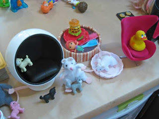 I am very proud of her complete integration of all types of toys - cats, dogs, mice, Rement foods, wind-up UglyDolls, tiny eraser-Disney-princesses, a teeny rubber duck, and, my collectible designer chairs... hey!?