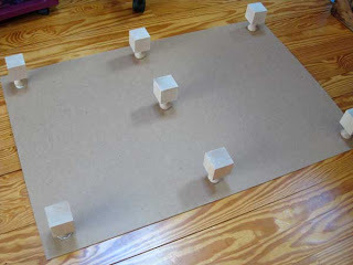 Meanwhile, I attached wooden craft pieces to the bottom of another sheet, using Weldbond glue. Good stuff. I used Weldbond to glue the painted sheet to the footed sheet and clamped the pieces together with bulldog clips.