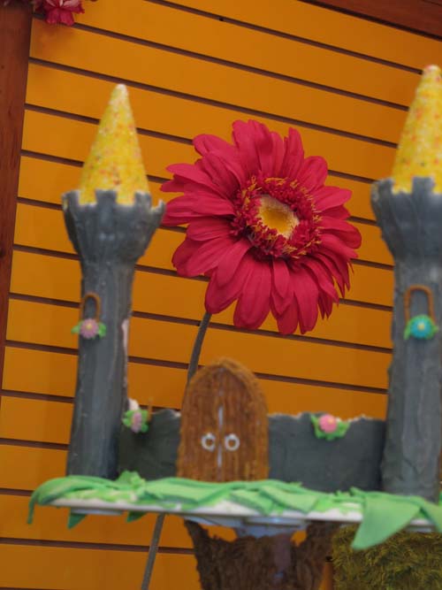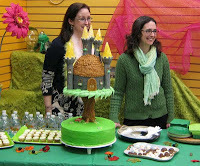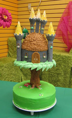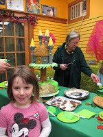 Postscript... Postmortem.. alas, the castle hath toppled-eth. We tried to keep the front of the castle pristine for as long as possible. So cake was cut and served from the base, until we discovered that the castle part was CHOCOLATE! AHHH! So we cut and served the back of the castle. Near the end of the party I spied chunks of chocolate cake on the floor... and my eye moved up and up until... EEEK! The castle had fallen off!!! It was lying on top of the tiny fairy cakes. It was still delicious. In fact, it IS still delicious. We had some after dinner tonight as part of our Ostara celebration (yes, I know it is a day late!)
