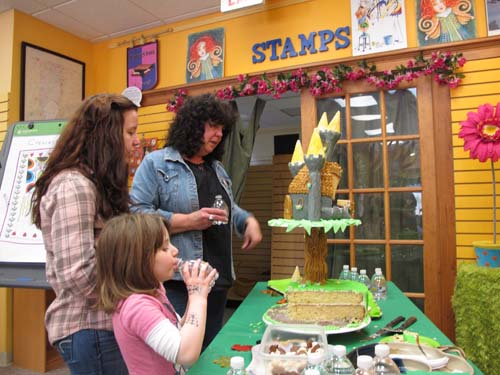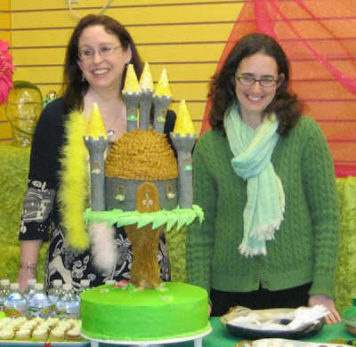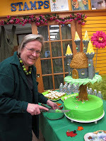 Postscript... Postmortem.. alas, the castle hath toppled-eth. We tried to keep the front of the castle pristine for as long as possible. So cake was cut and served from the base, until we discovered that the castle part was CHOCOLATE! AHHH! So we cut and served the back of the castle. Near the end of the party I spied chunks of chocolate cake on the floor... and my eye moved up and up until... EEEK! The castle had fallen off!!! It was lying on top of the tiny fairy cakes. It was still delicious. In fact, it IS still delicious. We had some after dinner tonight as part of our Ostara celebration (yes, I know it is a day late!)Postscript, Postscript - As for the books... you may remember that I wrote about Jen back in October of 2011 when she was doing a Kickstarter project to raise money for this book. If you want to know more about her and see all her links, take a look at that post. If you would like to buy her books, or mine, please consider buying them from one of our sites (Etsy is good!)... http://www.etsy.com/shop/jennifercarson for Jen's and www.bumblebat.com for mine. If you prefer to shop at your local bookstore, that is very cool! Or use Amazon... we don't mind as long as you read our books!! :-)