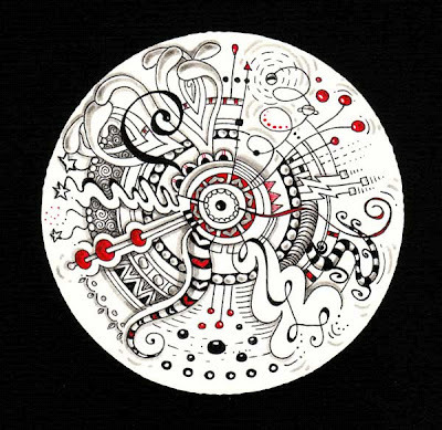 I used one of the blank tiles (most in the pack are pre-strung), started from the center-ish, added some lines and danglies - working around in a circle. Then, I added some Btl Joos and Mooka tangles. I added more straight lines behind the tangles and dangles and filled some of them with other tangles. I started shading with a pencil, but didn't like the way the paper was responding. I tried a gray Pitt marker, looked a little better... the paper is soft and very absorbative. I thought it still seemed a little flat, so I added some punches of red.I like it. Although it is more an illustrated "Big Bang!" than a serene, contemplative, balanced Zendala. But I am more of the former than the latter anyway. In the CZT group on Facebook, there are so many seriously beautiful Zendalas appearing all of a sudden. Since I am feeling a little (w)itchy this week, I will go and post this one and see what people say. Hee hee. :-)