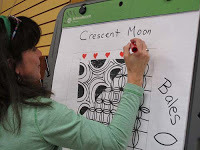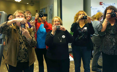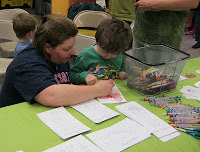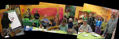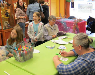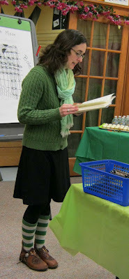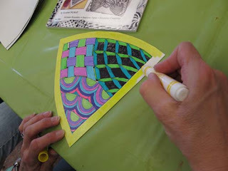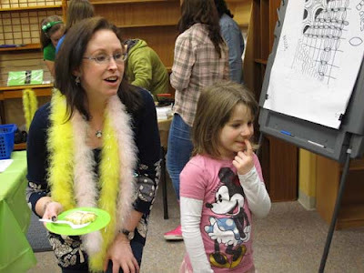 (Click pic to see larger) - We started off with a fairly quick Zentangle demo. The kids sitting on the floor, and a handful of adults were willing to give it a try. All those serious looking folks in the back were too timid... or maybe they just came for the cake?