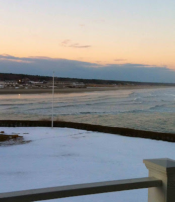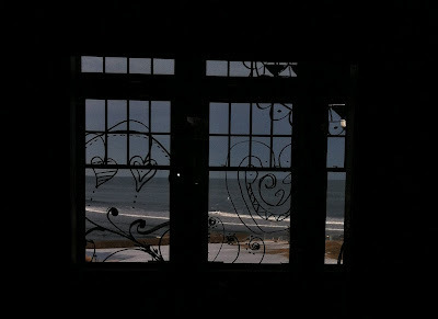 Through the tangled window... to the beach. Can you believe we had this view from our workroom?! (Snow, sea and surfers. Seriously.)
