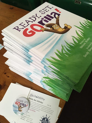 I got a stack of Ready, Set, GOrilla! books just in time for the Book Birthday Party this Saturday at the Velvet Moose in Warner.