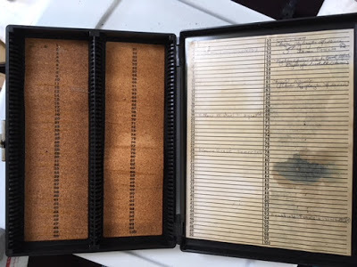Meanwhile, I've found some interesting things while cleaning out my mom's garage, besides body parts in jars (she was a pathologist and medical examiner). But adventure is not without its dangers too. I found a bunch of "antique" microscope slide storage boxes - I dumped the slides and specimens, but take a look at this one...