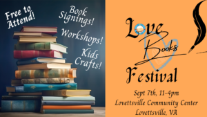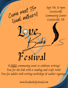Join me for Lovettsville, Virginia’s Love Books Festival , a Family Friendly Celebration of Books, Local Authors, and Literary Learning! September 7, 11 a.m.- 4 p.m. at the Lovettsville, VA Community Center, 57 East Broad Way, Lovettsville, VA 20180
