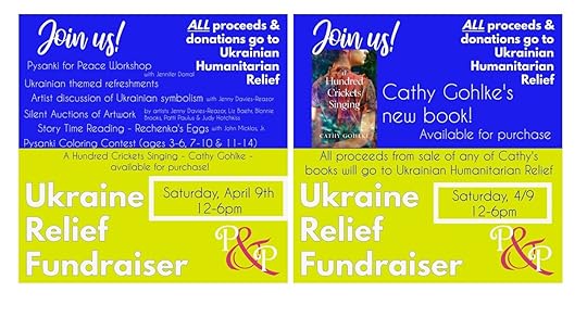 Saturday, April 9, at The Palette & The Page in Elkton, MD, special fundraising events for Ukrainian Humanitarian Relief will be held, including a Pysanky for Peace Workshop to make Pysanky eggs (registration required), an artist’s talk on Ukrainian symbolism and the Story Time Reading by a local children’s author of Patricia Polacco’s wonderful book, Rechenka’s Eggs, as well as Ukrainian themed refreshments. April 9 proceeds from the sale of ANY and ALL of my books at The Palette & The Page, including A Hundred Crickets Singing, will be donated to this Ukrainian Humanitarian Relief effort.