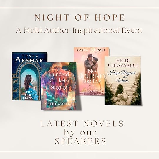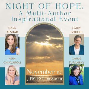 On November 10 I’m looking forward to joining award winning authors Tessa Afshar, Heidi Chivaroli and Carrie Turansky for A Night of Hope with readers. We’ll all share how the Lord is working in our lives, hoping that you’ll also find encouragement in your daily walk. We’ll share a little from our latest books and highlight Tessa’s new book, The Hidden Prince, to be released that very day, as well as some fun giveaways. Online attendance is limited to 300 but the event will be recorded and can be shared later. Autographed copies of our latest books can be purchased the week of the event. I hope to see you there!