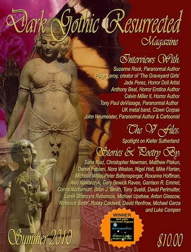 Four of my poems, "Once Bitten," "This Kiss," "Just a Little Bit of Hocus Pocus," and "Letting Him Go," appear in the July Issue of Dark Gothic Resurrected out now. The issue is available in both print and e-book (pdf download) formats from LULU.com, fairly priced at $10 and $5 respectively. To order your copy visit http://www.lulu.com/product/paperback/dark-gothic-resurrected-magazine--summer-2010/11609560 . For more information about the magazine and their submission policy, please visit: ...