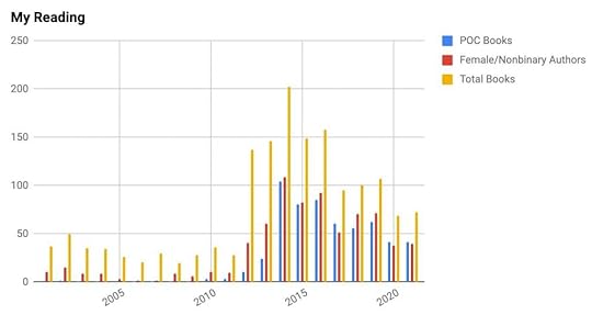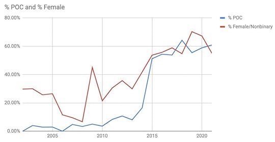 58% POC books.55% female/nonbinary authors.Here’s how that compares to previous years: