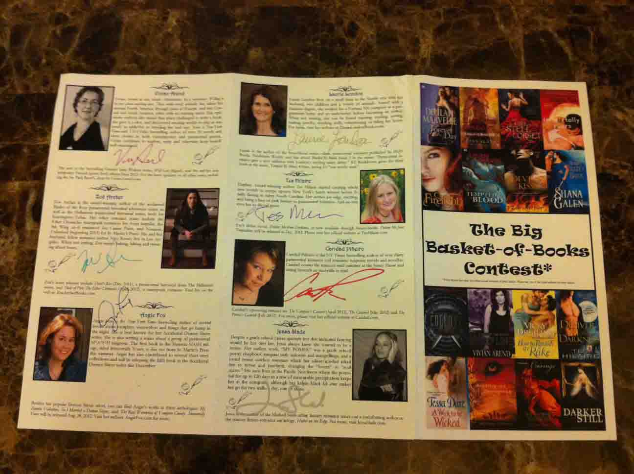 I had already signed at the Expo on Thursday, so at the Book Fair, I pretty much just got to be a fan. I met some authors I'd come to know online. I collected autographs. I participated in this "The Big Basket-of-Books Contest," where I had to get every participating author's signature. I wanted them anyway and I kept saying, "If I have to turn this card in to enter, forget it. I'd rather have the autographs." A pretty cool keepsake. Glad I didn't have to turn it, but just had to write down my name and phone number.