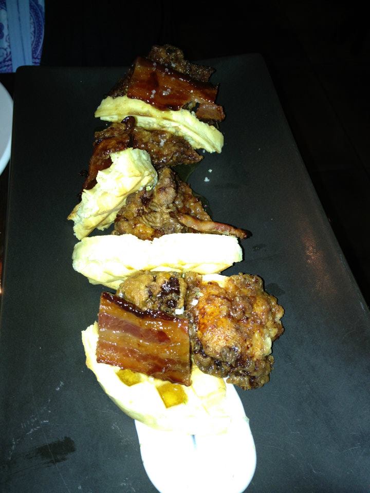Fried Chicken Thighs - buttermilk waffles,house smoked maple, candied bacon, hot sauce-ranch