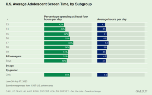 The 2023 American Time Use Survey found that teens aged 15 to 19 spent 8 minutes a day reading for personal interest. Compare that to the “up to 9 hours per day” the American teenager spends on screen time. Teens in that age group reported spending, on average, roughly 5 hours per day on screens in the 2023 Gallup Familial and Adolescent Health Survey.