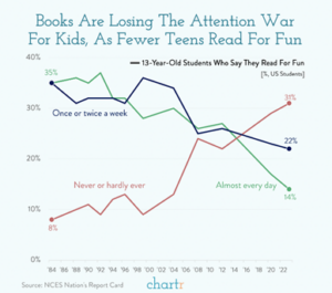 Consider the fact that far fewer students read for pleasure compared with just a few years ago. For time immemorial, we teachers have cajoled, encouraged and prodded students to read on their own. But even multiplying our efforts tenfold now won’t get us back to baseline reading rates of, say, 2005. The numbers of students who read outside of school and the amount of reading they do have fallen through the floor.