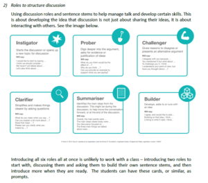 I also loved this framing of “discussion roles.” It’s similar to what Ben and company put together at Ipswich Academy but it adds additional roles for students to take on. Naming that they can seek probe and clarify adds real value, I think. But I also love the guidance at the bottom: don’t try to teach (or ask students to use) all six roles at once. Let them learn them a few at a time. It’s great practical advice.