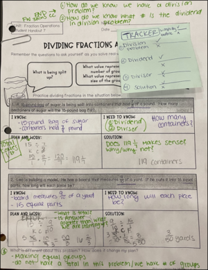 She’s written out her Exemplar in blue pen and pencil. She has Planned for Error with her back pocket questions in green. When Paige implements this lesson, she’ll be able to circulate thoughtfully, checking student responses against her exemplars and quickly recognize where to give them feedback. But she’s likely to do a very good job of this because she’s thought through the mistakes she’s likely to see and the questions she might ask in response: “Does 119 1/7 make sense? Why or why not?” and “What is total? Is [the] answer [going to be] greater than what we are starting with?”