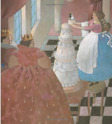 by Rosemary Minard in 1975. I haven't traced an earlier version but I haven't tried either. But I wanted to share the history I do know in case the tale sounds familiar and the picture book doesn't.I had forgotten about this tale and I am so happy it has been reprinted. A common SurLaLune request is for tales with strong mothers and this tale fits the bill. We have a mother who is a talented baker, caring mother, and overall clever woman. She is kidnapped by the fairies for the Fairy King who wants to eat her wonderful cakes. The story will especially resonate with mothers of young children since the chaos of a child-filled home provides the solution and much of the story's humor. Although watching her baking tools and child and pets float away on invisible wings is a definite early highlight in the story.