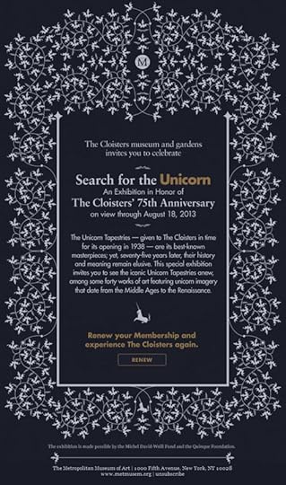 Anyway, since others are on vacation this week, perhaps in New York City, I wanted to share this email I received--the design is prettier than the imagery on the website, but I will direct you there, too. I cannot be too enthusiastic about the Cloisters for myself. My visit was my last stop during a multi-day trip to NYC five years ago and was an unexpected highlight. I have copied and pasted my description of the experience below. So if you are in NYC, don't miss a trip to see the Search for the Unicorn exhibit. I would love to see it myself!