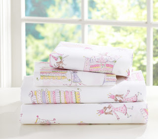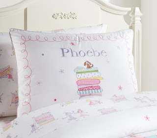 Last year I shared Pottery Barn's Grace sheeting design, which they still have so it must be popular, which has a Frog Prince theme. This year they are also offering the Phoebe design which is Princess and the Pea.