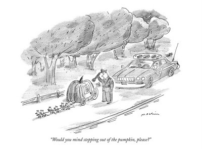 "Would you mind stepping out of the pumpkin, please?"Art.com has a new series of New Yorker cartoons with fairy tale inspirations available for order. I thought I would share a few over the next few days. This one is by Michael Maslin. Published October 18, 1999. A traffic cop with a flashlight has pulled over Cinderella's coach after it turns back into a pumpkin.