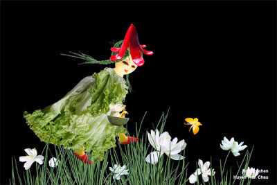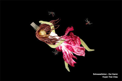 Vietnamese master cutter Huyen Tran Chau has crafted a series of fairy tale figurines made from vegetables. A selection will be exhibited in the city library in the German town of Lübeck. The artist herself was present at the official opening.I couldn't find more images from this exhibit other than the one above but here are some old images by the same artist that I found on a different blog here and here. I love these. They are quite fun.