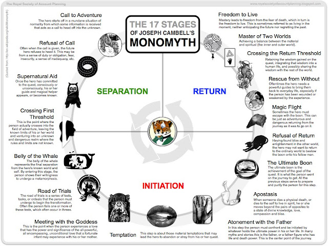 Since I apparently made today Infographic day here on the blog, I wanted to share this infographic of Joseph Campbell's 17 stages of The Monomyth or "Hero's Journey". I discovered it at Modern Mythology who credits The Royal Society of Account Planning. There's much afoot this year with the 25th anniversary of Campbell's death. But this post is just about the infographic since it makes a helpful tool or reminder for those of us who don't reference this everyday and sometimes need a refresher. Like me.