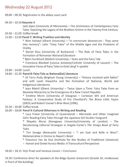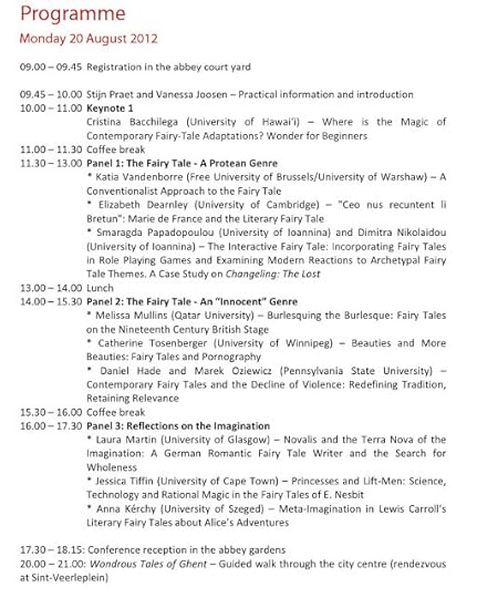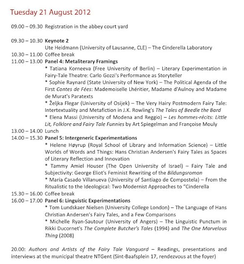 The Fairy Tale Vanguard conference happened in August but I wanted to share the Programme (alas, no abstracts) with you since it looks like it was a great conference. Did anyone reading here attend and d would you like to report to the SurLaLune readership? The Fairy Tale An "Innocent" Genre panel papers sound particularly interesting to me in my own reading although it all sounds marvelous, of course.