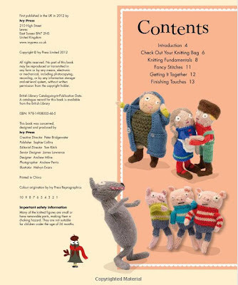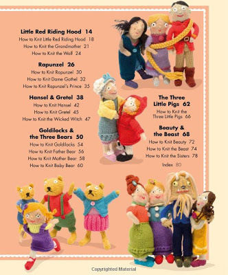 since July and you can look inside the book on the UK site but not yet in the US. Isn't it fun to see the subtle variations in the covers above that supposedly make the book more appealing to their respective markets? Apparently Fiona Goble is one of the knitting grand dames in the UK but is relatively unknown in the US. Here are images of the Table of Contents pages as well as some of the interior book pages. It looks like a very useful book of learning techniques and, of course, making fun fairy tale figures. I don't knit so I will have to admire other people's work with these.