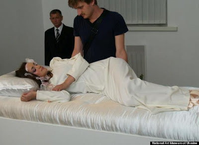 A group of women were slated to snooze in the central gallery of the National Art Museum of Ukraine this month, inviting worthy male suitors to try and wake the slumbering women with a single kiss. They're not under the spell of an evil witch or a poison apple however; instead, the ladies been recruited to participate in an art exhibit appropriately titled "Sleeping Beauty."The fairy-tale inspired project was imagined by Ukrainian-Canadian artist Taras Polataiko. Influenced by an old story by Charles Perrault, where a young maiden is cursed to sleep for 100 years, only to be awakened by true love's kiss. In the spirit of this "once upon a time" literature, Polataiko cast several female volunteers as his performance beauties, tasked with "sleeping" in the Ukrainian museum for two hours at a time, every day from August 22nd until September 9th. Dressed in white and laid upon an elevated bed, the women lay motionless in the museum's space, awaiting a kiss from that one perfect museum patron.