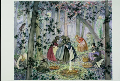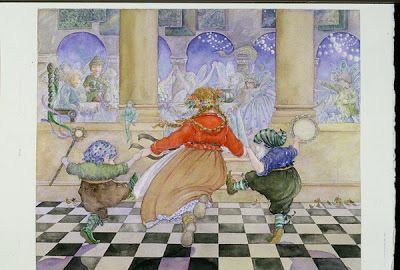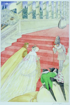 Today is the last day for highlighting the illustrators in the Fairy Tale Art: Illustrations from Children's Books exhibit. Jane Dyer is our eighth and final illustrator. There isn't much biographical information about her on the web--most searches come up with oodles of information on a different Jane Dyer, a politician instead. Nevertheless, Dyer has been illustrating beautiful books for many years. I have just a smallish list of them all at the end of this post. For now, I will offer her beautiful work from the exhibit...