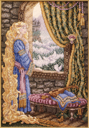 Yesterday I featured rare, out of print and now expensive (if you can find them patterns). Today I am sharing two patterns by Teresa Wentzler which have been reprinted and can now be downloaded for just $6.99 each online. That's savvy and the joys of the internet all at once. Love! Wentzler has many fantasy oriented patterns available through her online distributor. Cinderella (Stroke of Midnight) and Rapunzel are the two fairy tale themed ones. Rapunzel is a very popular inspiration for cross stitch patterns--and these predate Tangled so we can't blame/thank Disney for it. This Rapunzel reminds me very much of Lady of Shalott.