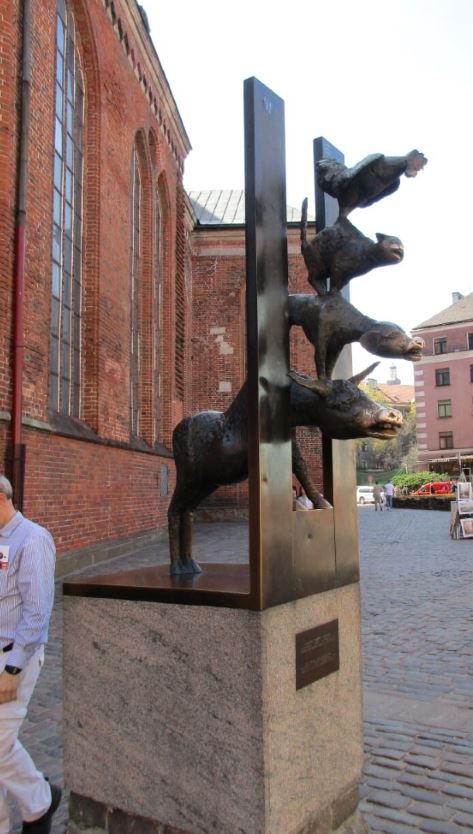 One of our ports of call was Riga, Latvia. There were other discoveries that day but this one merits its own post. A sighting of the Bremen Town Musicians near St Peter's Church in the Old Town. I had a few sightings of this tale on the trip as I recall, but this was a favorite.