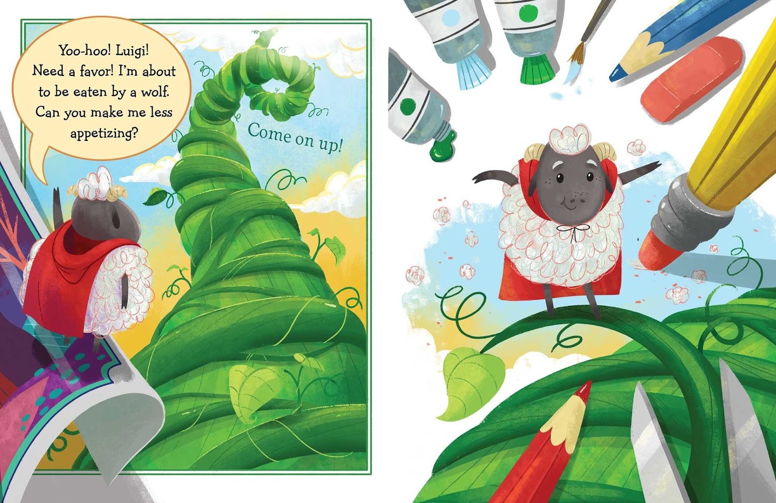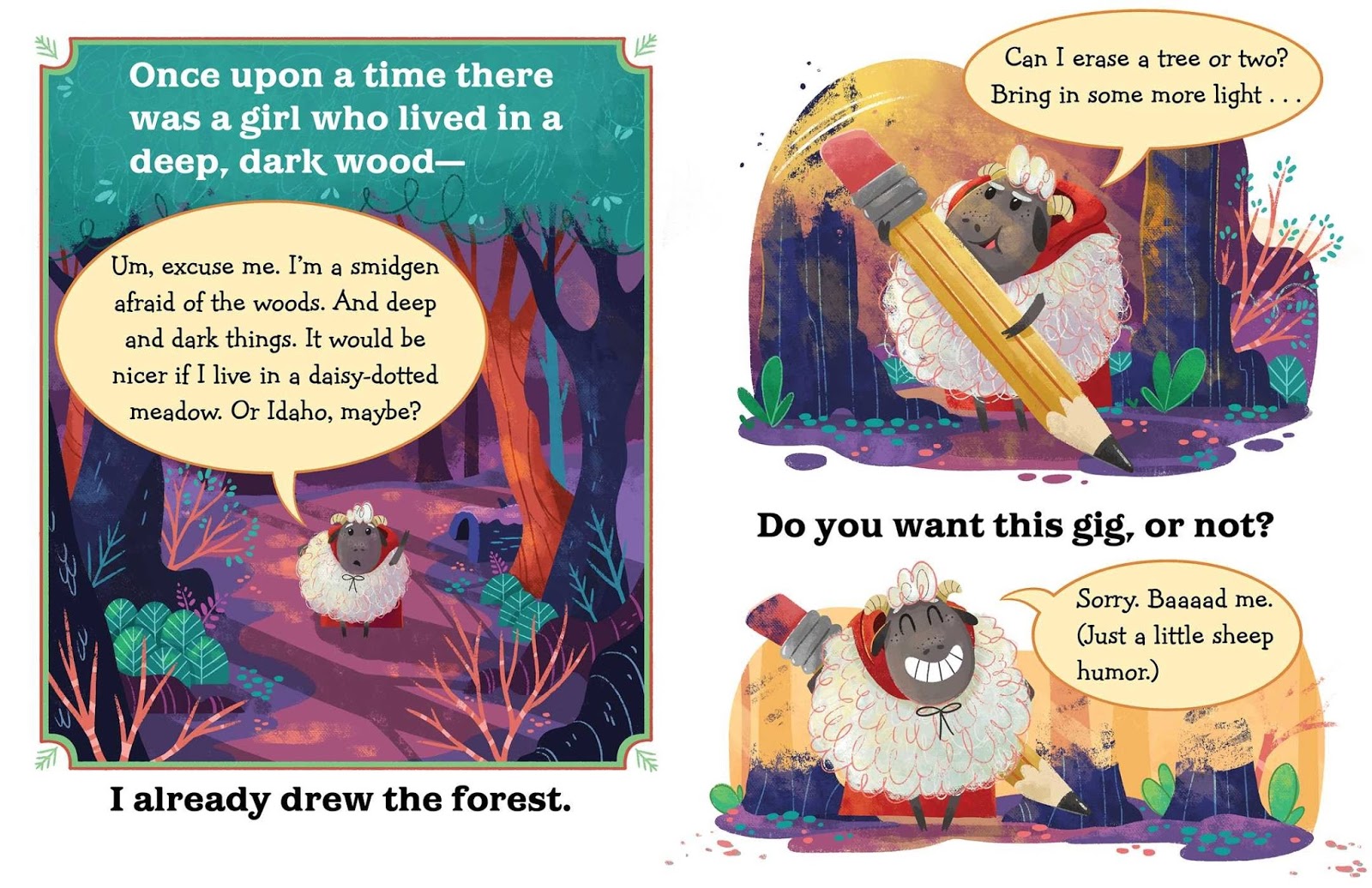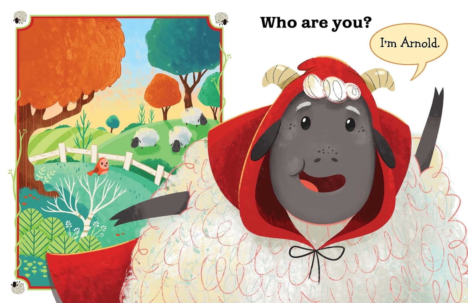 Arnold is an eager young sheep who is excited to be in his very first book. No problem-o! Except he’s a bit big and fluffy to play Little Red Riding Hood, and he’s a tiny bit scared of the deep dark woods. Oh, and he has a friend who would be just perfect as Granny…perhaps the author wouldn’t mind a few suggestions?