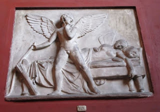 The small cupids represent various aspects of love: The cupid with his eyes closed represents slumbering love; those kissing represent active, ardent love; the cupid laying his head on the shepherdess’s arm is hoping for love; the one patting the dog represents constancy and the one flying away fleeting love. Perhaps the cupid that is not clearly seen represents secret love.Finally, Thorvaldsen did several studies and other works of Cupid and Psyche, too. The museum site has some photos of the plasters and sketches. These are not as lovely to me since the plaster has deteriorated, but they provide a look into the artistic process. If this really interests you, search the site and see drawings and other works, too. For now see: